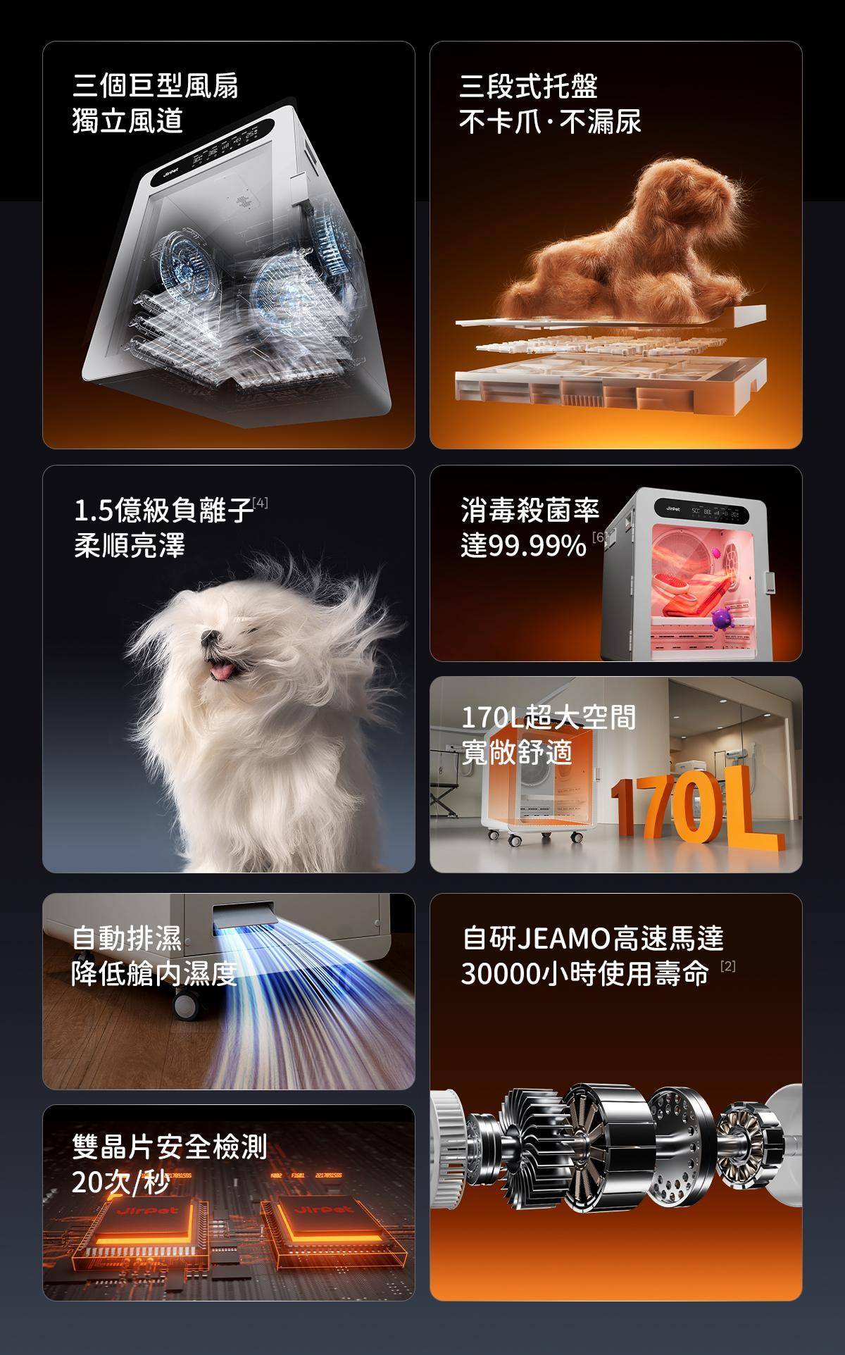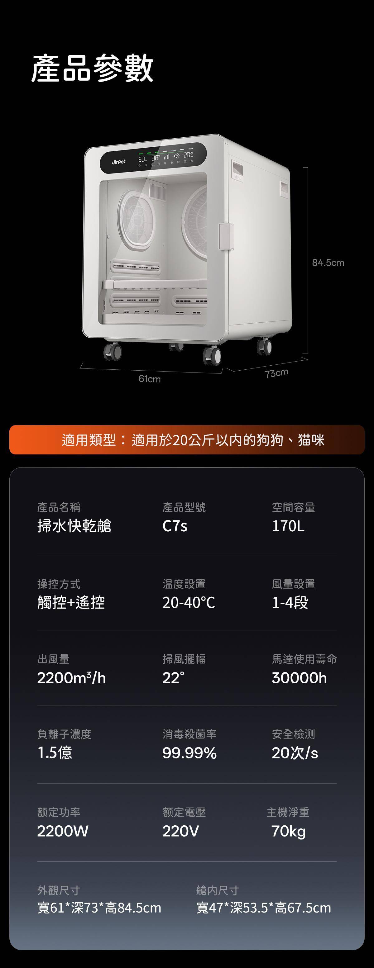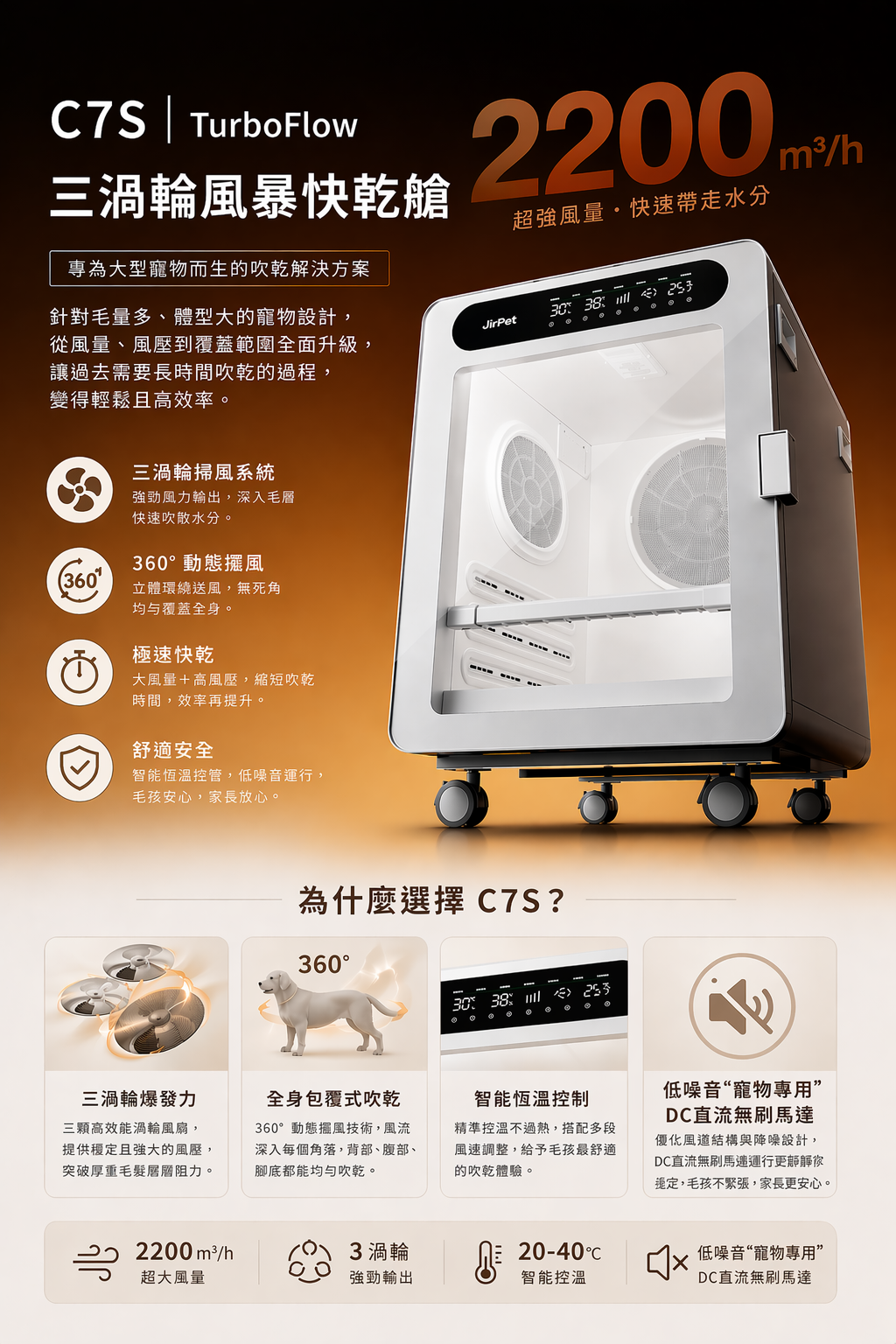 商品詳情 【Jirpet 大型 C7S|TurboFlow三渦輪風暴快乾烘毛室】【專為大型寵物而生的吹乾解決方案】針對毛量多、體型大的寵物設計, 從風量、風壓到覆蓋範圍全面升級, 讓過去需要長時間吹乾的過程,變得輕鬆且高效率。 TWD $49,980 TWD $39,980